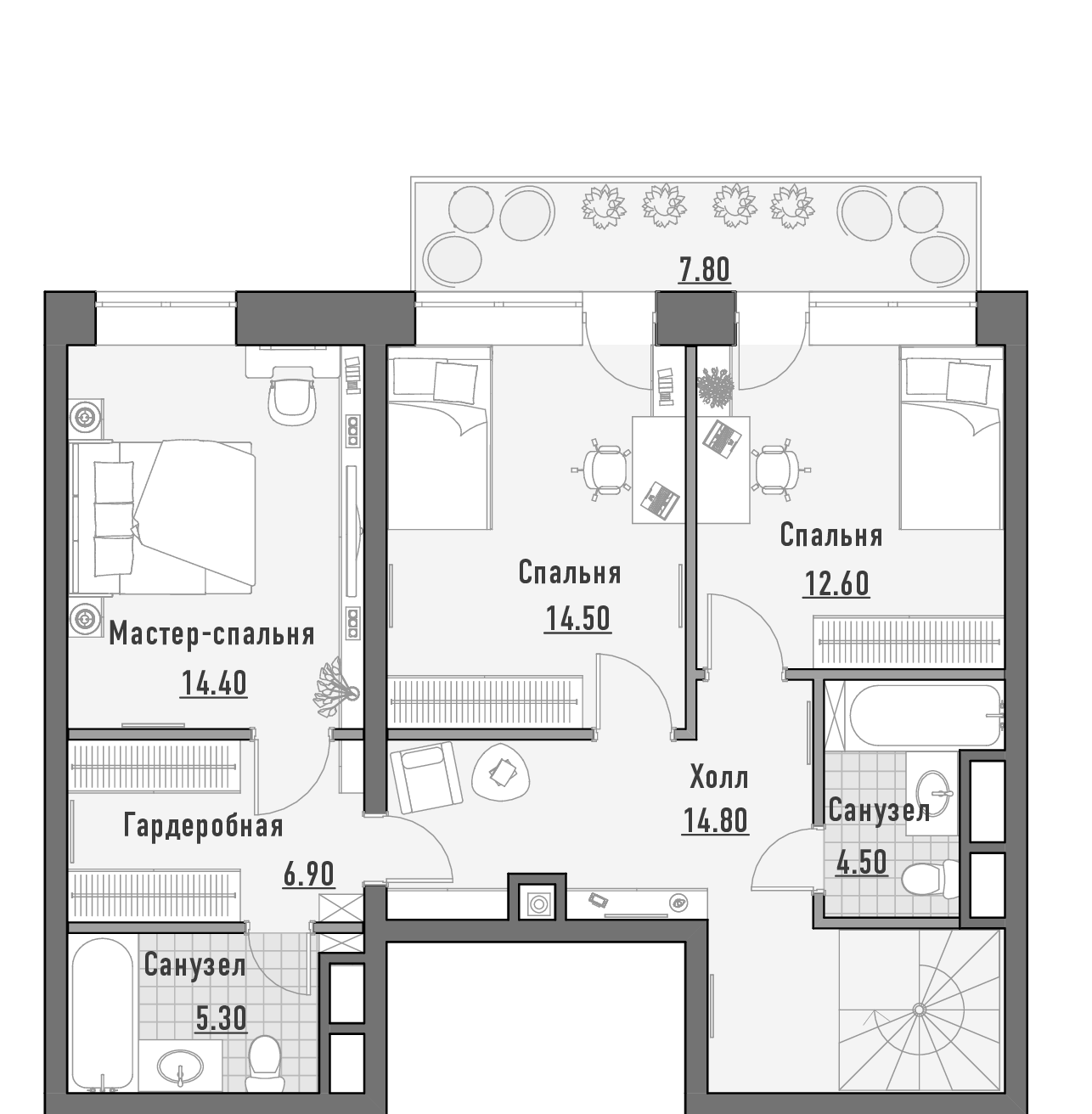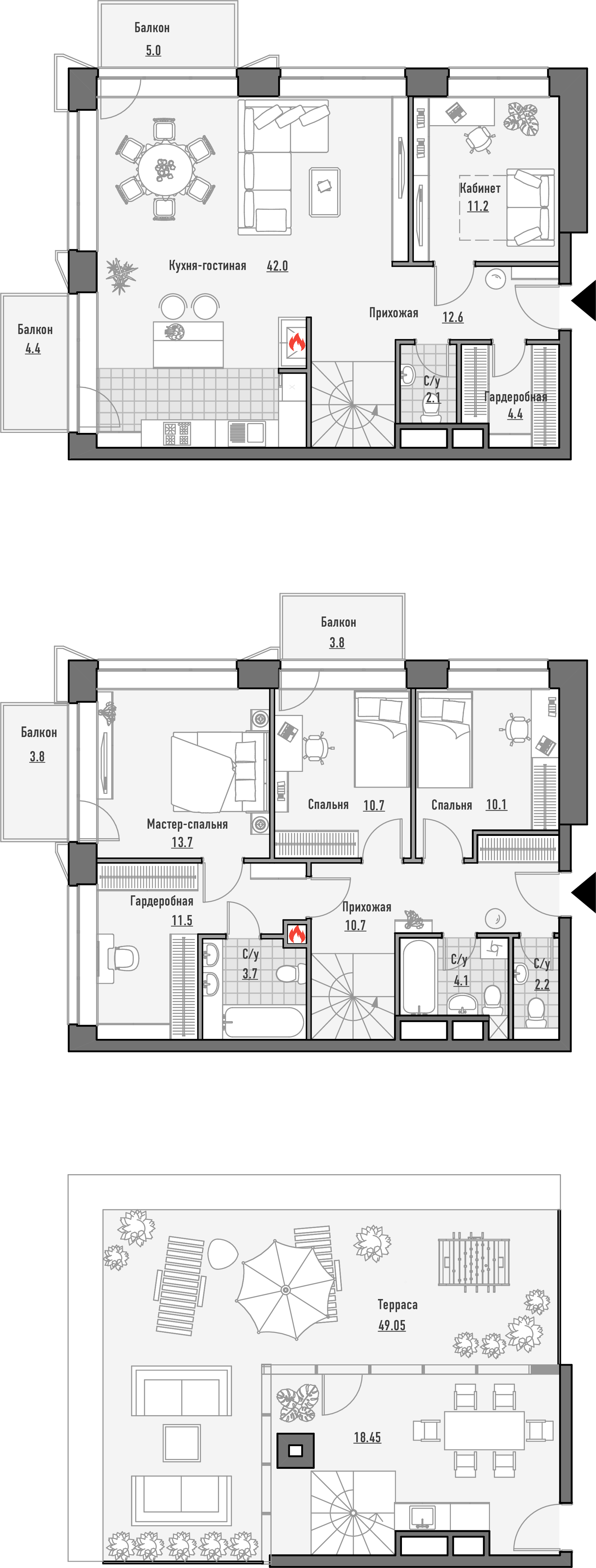 и функциональные апартаменты, а также несколько видовых пентхаусов, расположенных на верхних этажах. Площадь недвижимости в комплексе составляет 36.33-248.59 квадратных метров. Планировками предусмотрены широкие оконные проемы, изолированные комнаты, функциональные кухонные зоны и прихожие. Высота потолков в комплексе варьируется