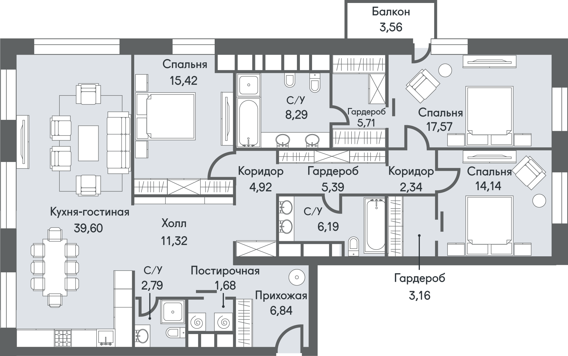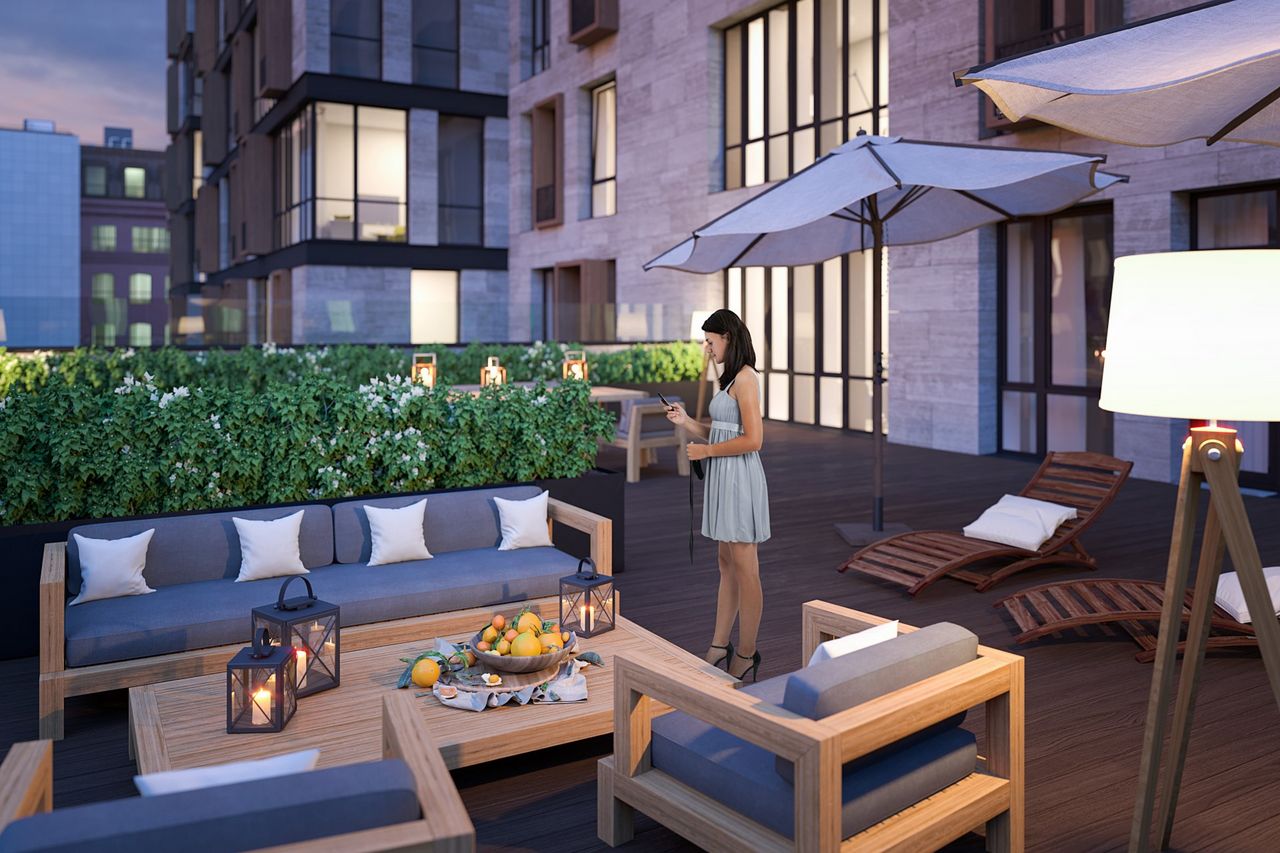 Стилистика внутреннего двора перекликается с архитектурой здания и общими элементами. Озеленение минималистично