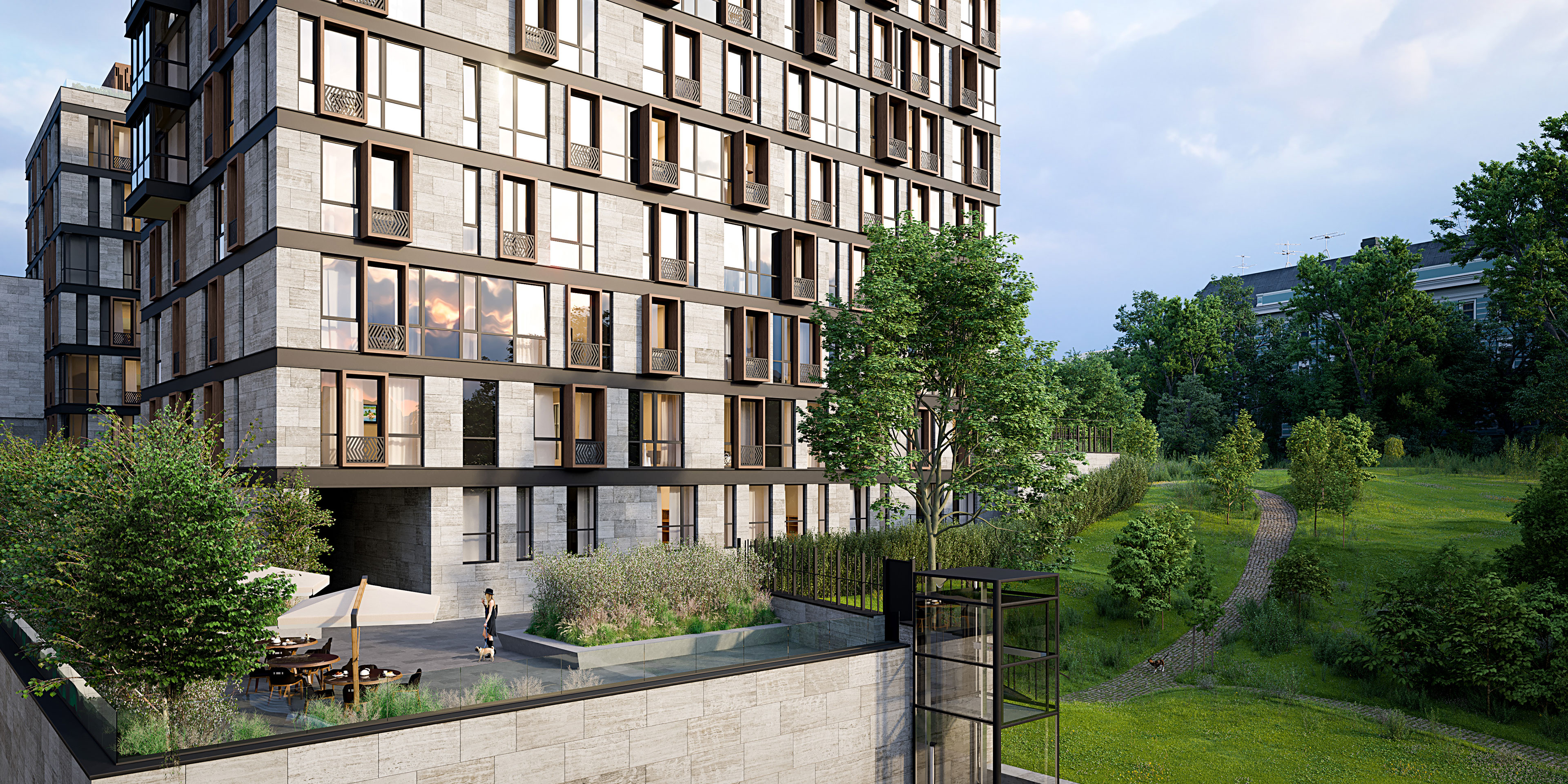 и Бульварного кольца. Комплекс представляет собой два корпуса переменной этажности с собственным выходом в парк. В доме 77 квартир площадью от 49 до 211 кв.м.