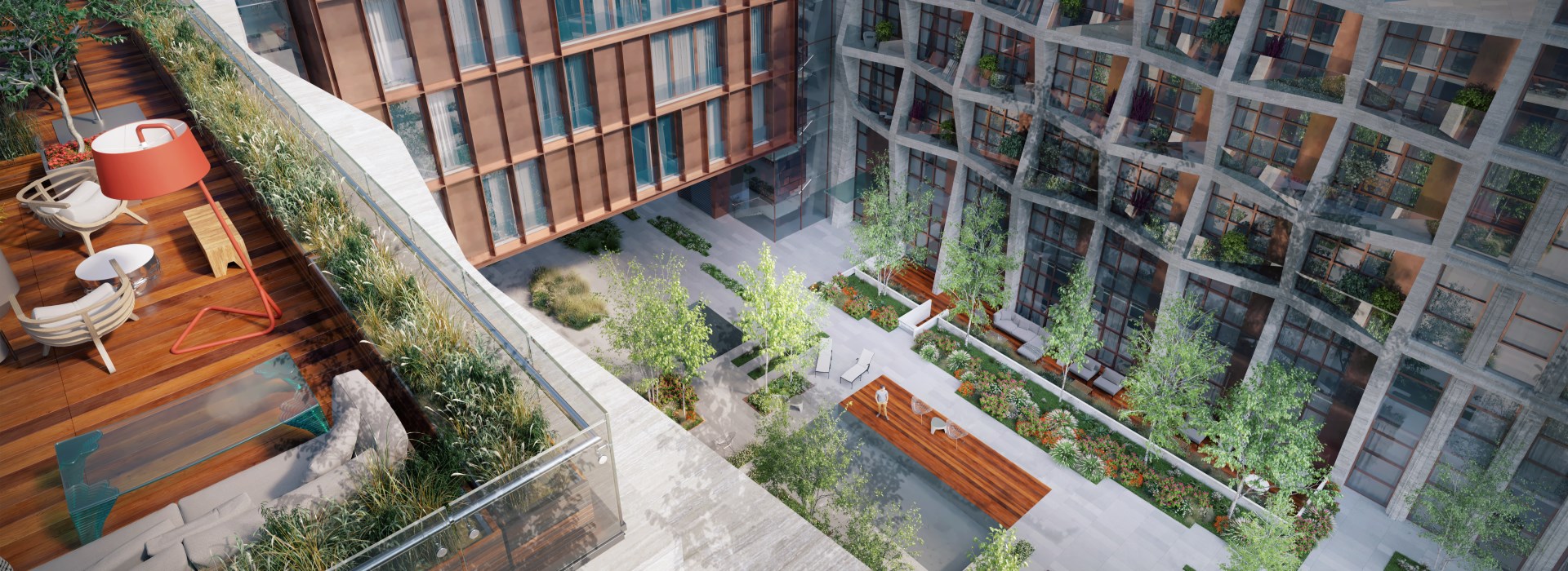 На территории собрания клубных домов есть собственный сад площадью 3 700 м2, что делает его одним из самых больших частных садов в центре Москвы.