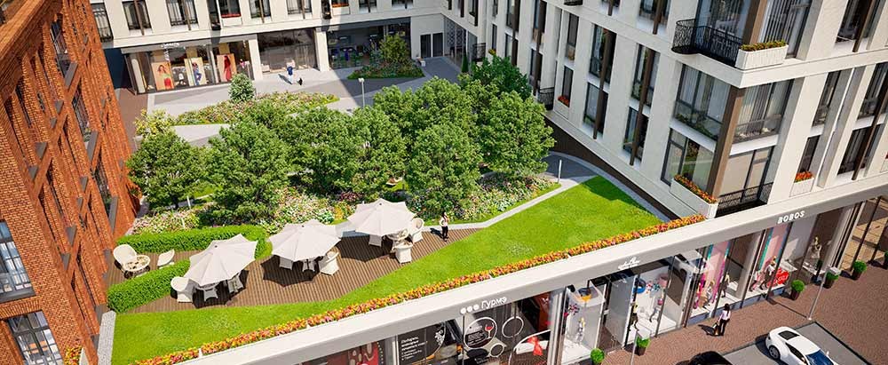 На территории мы создали два уникальных и просторных двора: детский двор для игр и отделенный от него ландшафтный двор-сад для безмятежного отдыха взрослых.